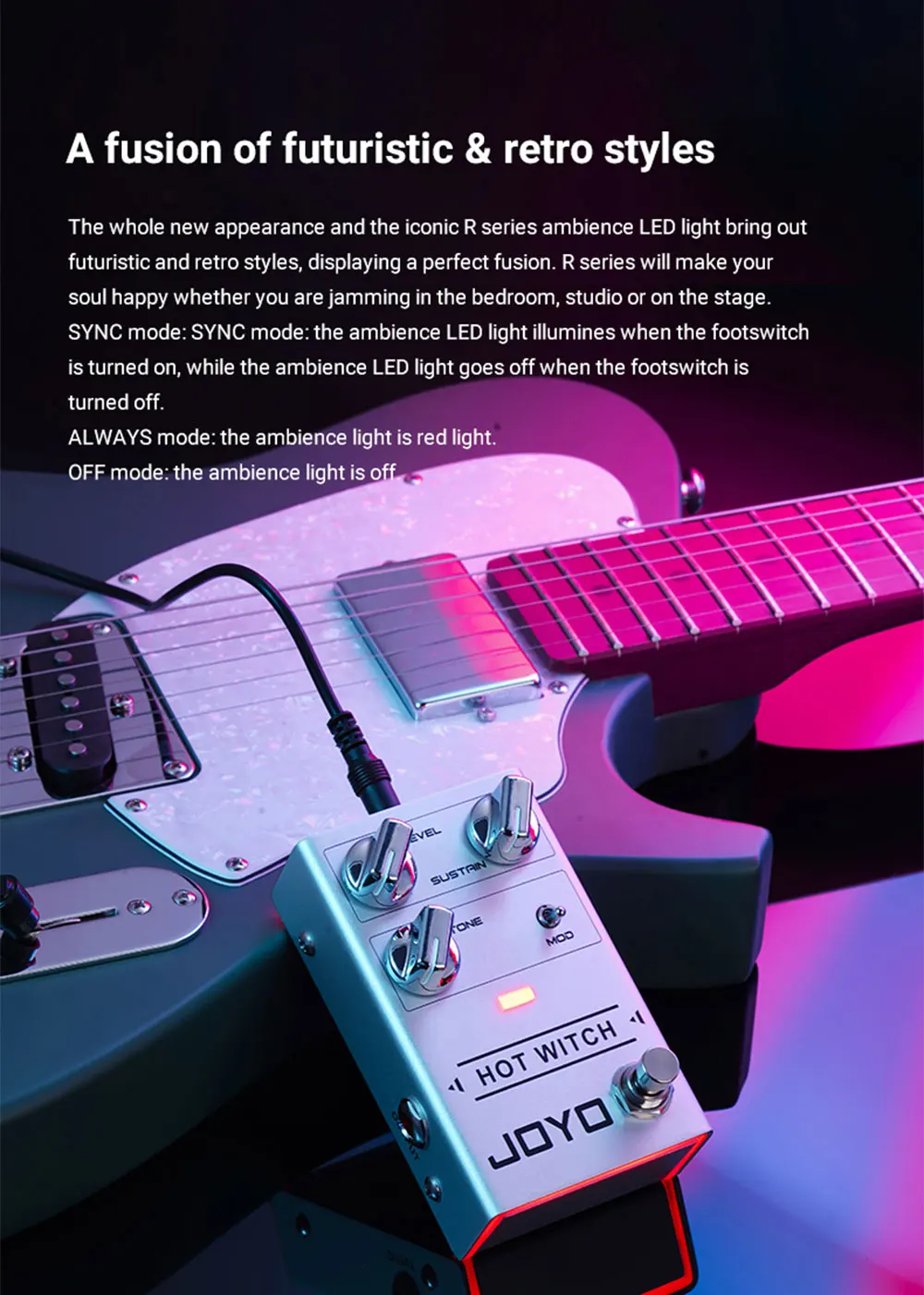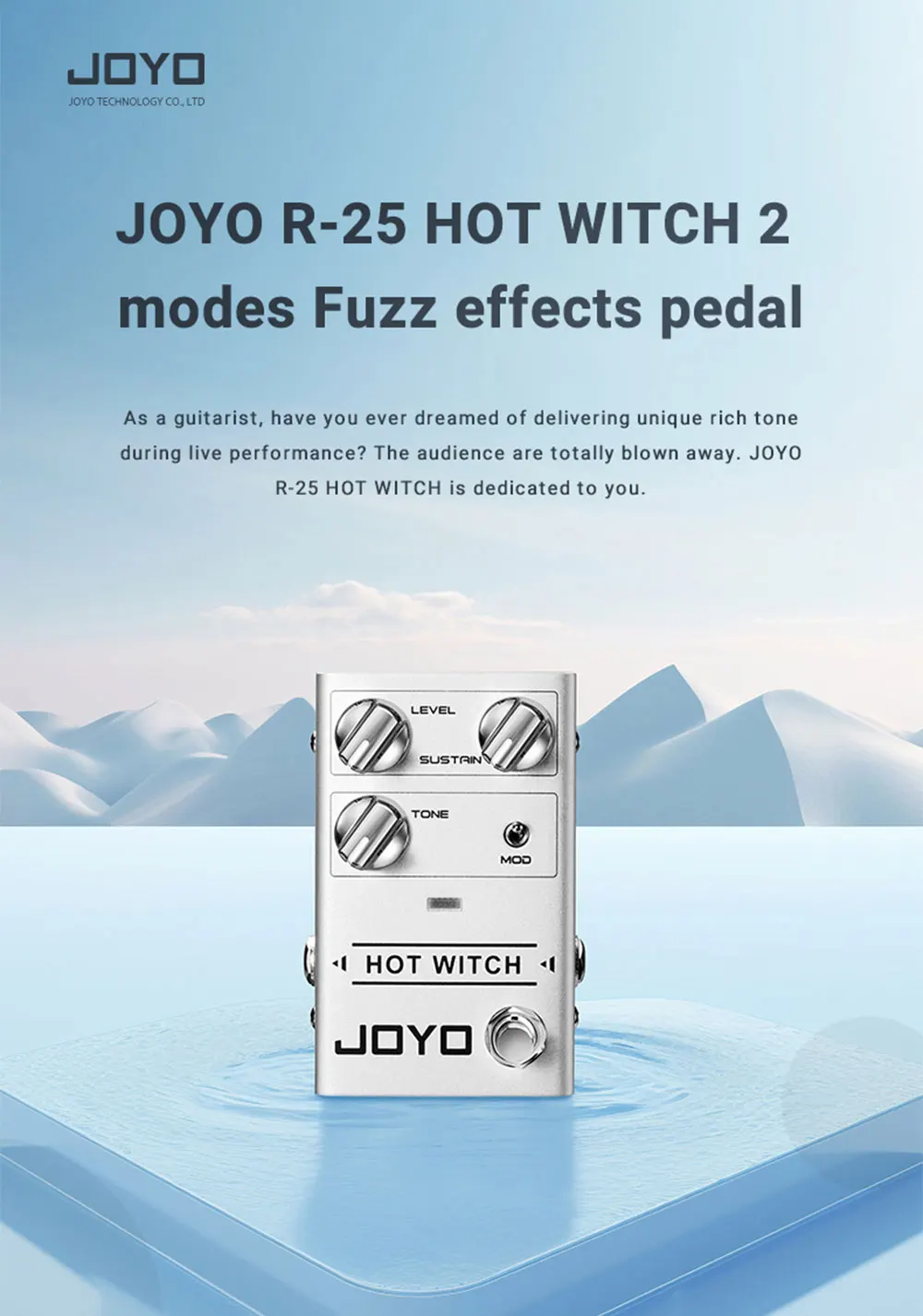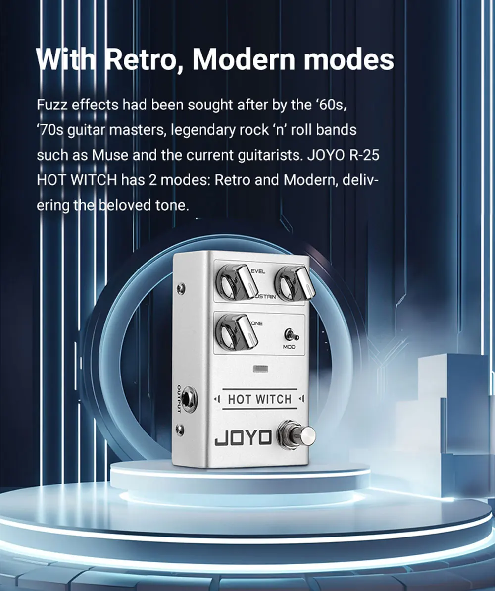 JOYO R-25 HOT WITCH, 2 modes Fuzz effects pedal is dedicated to electric guitarists, with 2 Fuzz modes: Retro and Modern, offering deep lows of rhythm guitar, smooth solos, facilitating your guitar performance nicely. JOYO R-25 HOT WITCH is ideal for both rhythm guitar and guitar solos, delivering soulful tone. Fuzz effects had been sought after by the 60s 70s guitar masters, legendary rock ‘n’ roll bands such as Muse and the current guitarists.